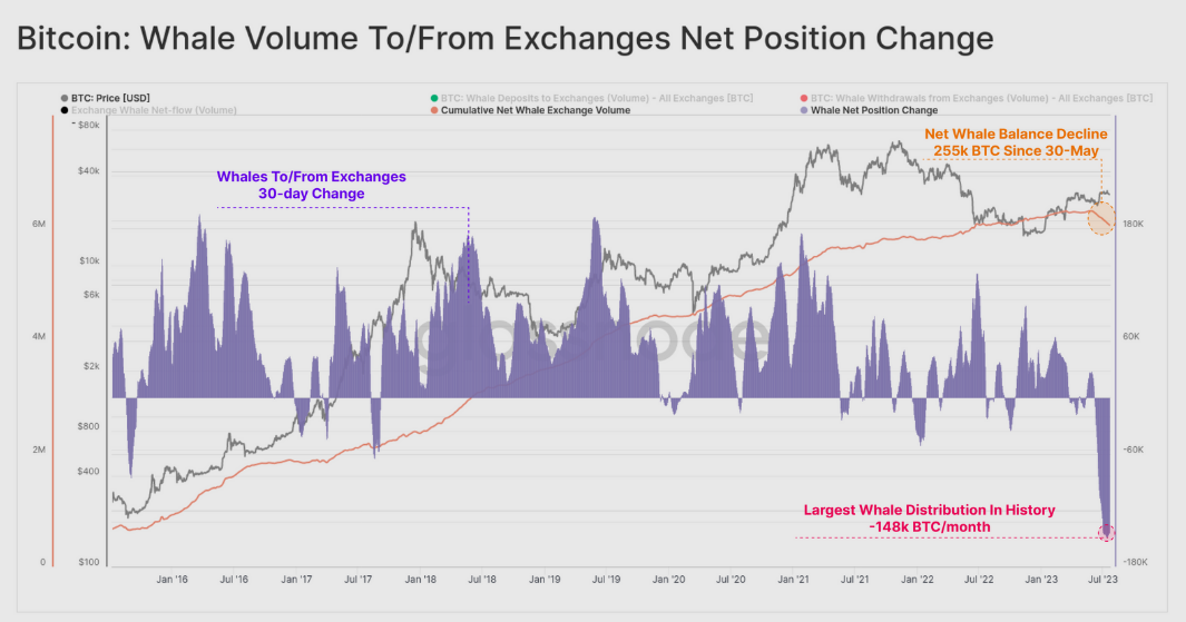 Metrika, ktorá sleduje pohyby veľkých investorov (veľrýb) na centralizovaných burzách ukázala, že držitelia bitcoinu sa ho vo veľkom na platformách zbavovali. Graf zobrazený nižšie signalizuje, že súhrnný zostatok veľrýb sa od 30. mája znížil až o 255 000 BTC. Zároveň analytici zaznamenali aj najväčší pokles mesačného zostatku v histórii v hodnote 148 000 BTC/mesiac.
