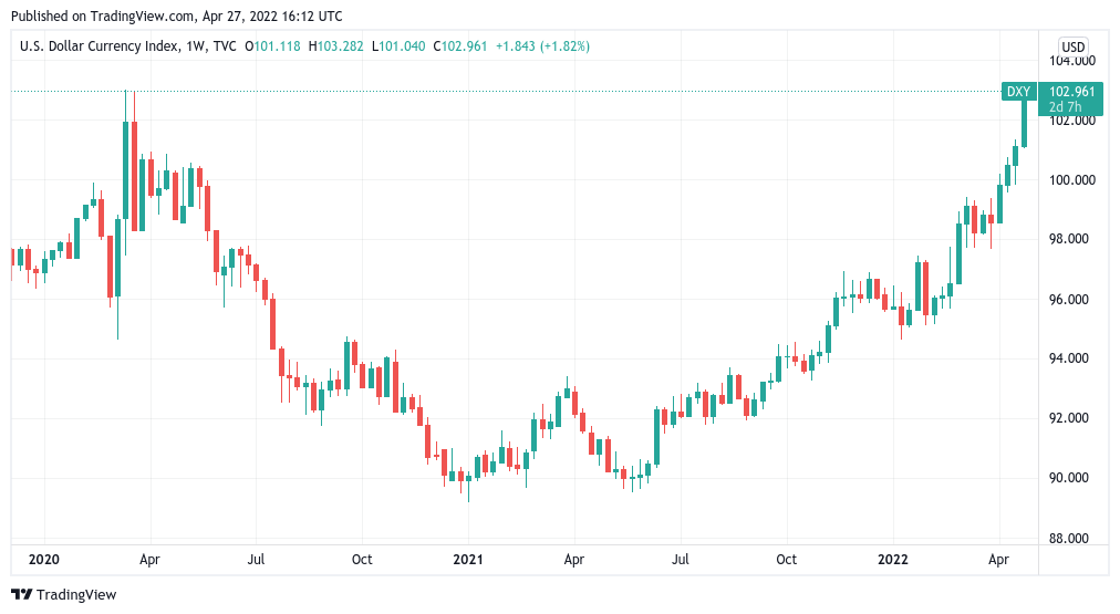 Reaching 103.28 on April 27, DXY is attempting to match and break above its highs from March 2020, something that would mean multi-decade highs should it succeed.