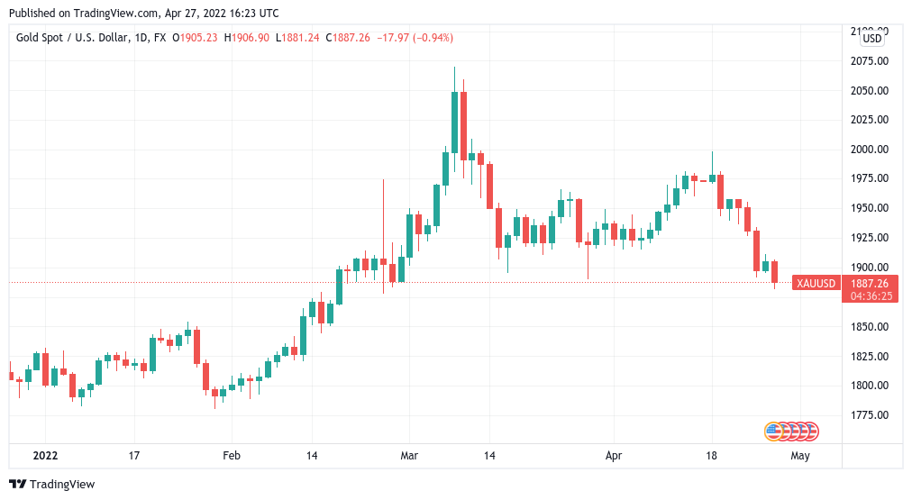 XAU/USD traded at $1,887 at the time of writing, having almost hit $2,000 on April 18.