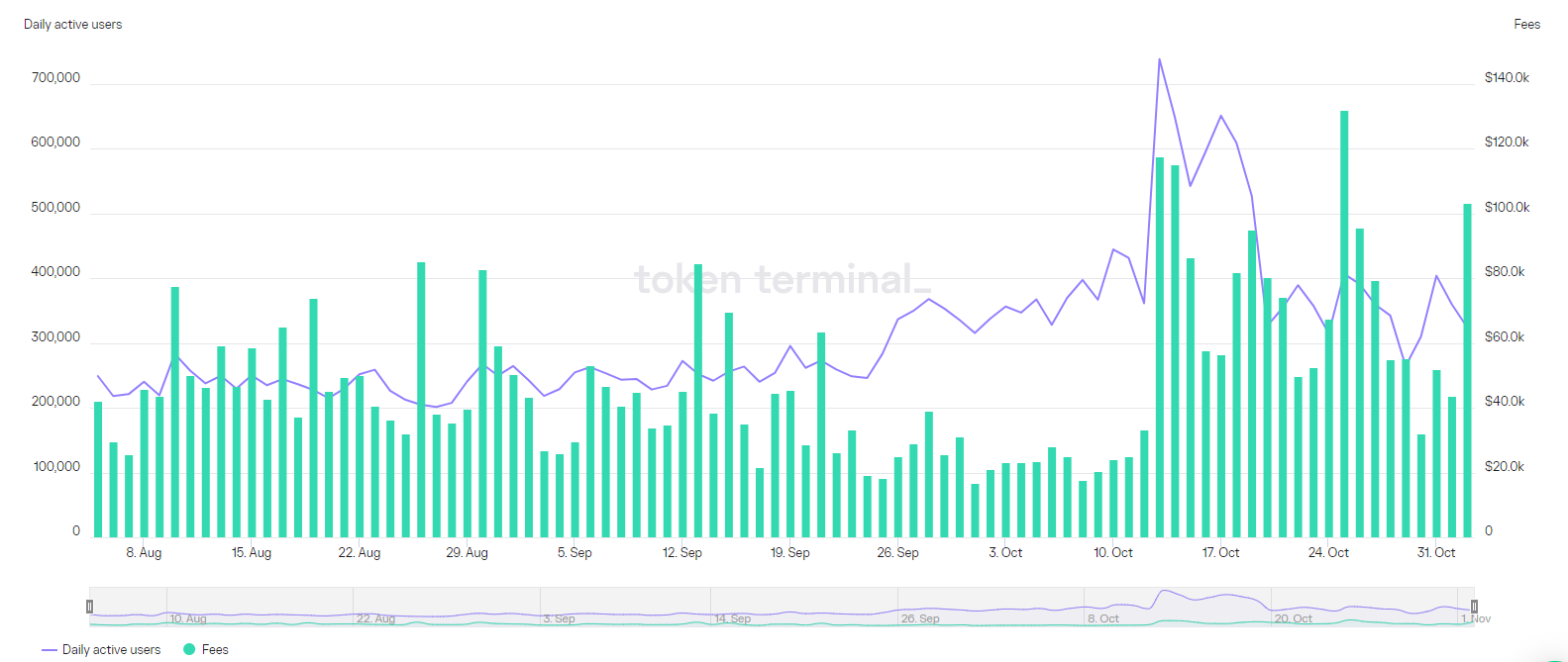 On August 5, Polygon collected $42,093 in fees and had 248,853 daily network users. By October 13, the network’s daily active users peaked at 737,815 following the success of the Reddit NFT avatar launch. Following on October 25 the network hit a 90 day peak of $131,940 in daily fees.