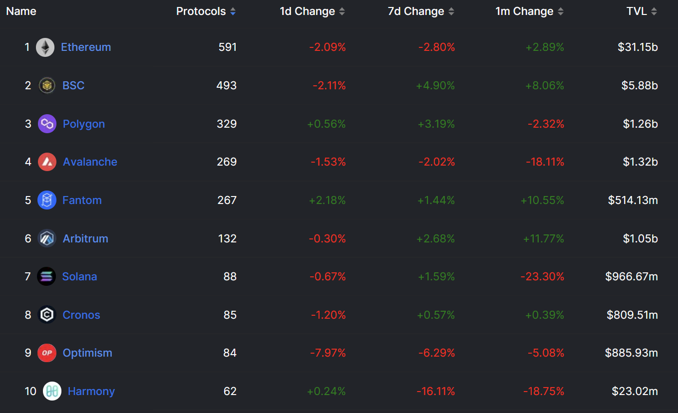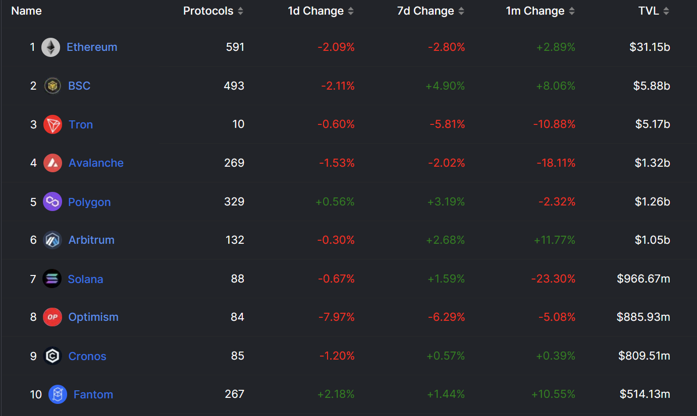 While the top 3 protocols, Ethereum (ETH), Binance Coin (BNB) and Tron (TRX) all have a TVL over $5 billion, MATIC, Avalanche (AVAX) and Arbitrum are the only others with over $1 billion in TVL.