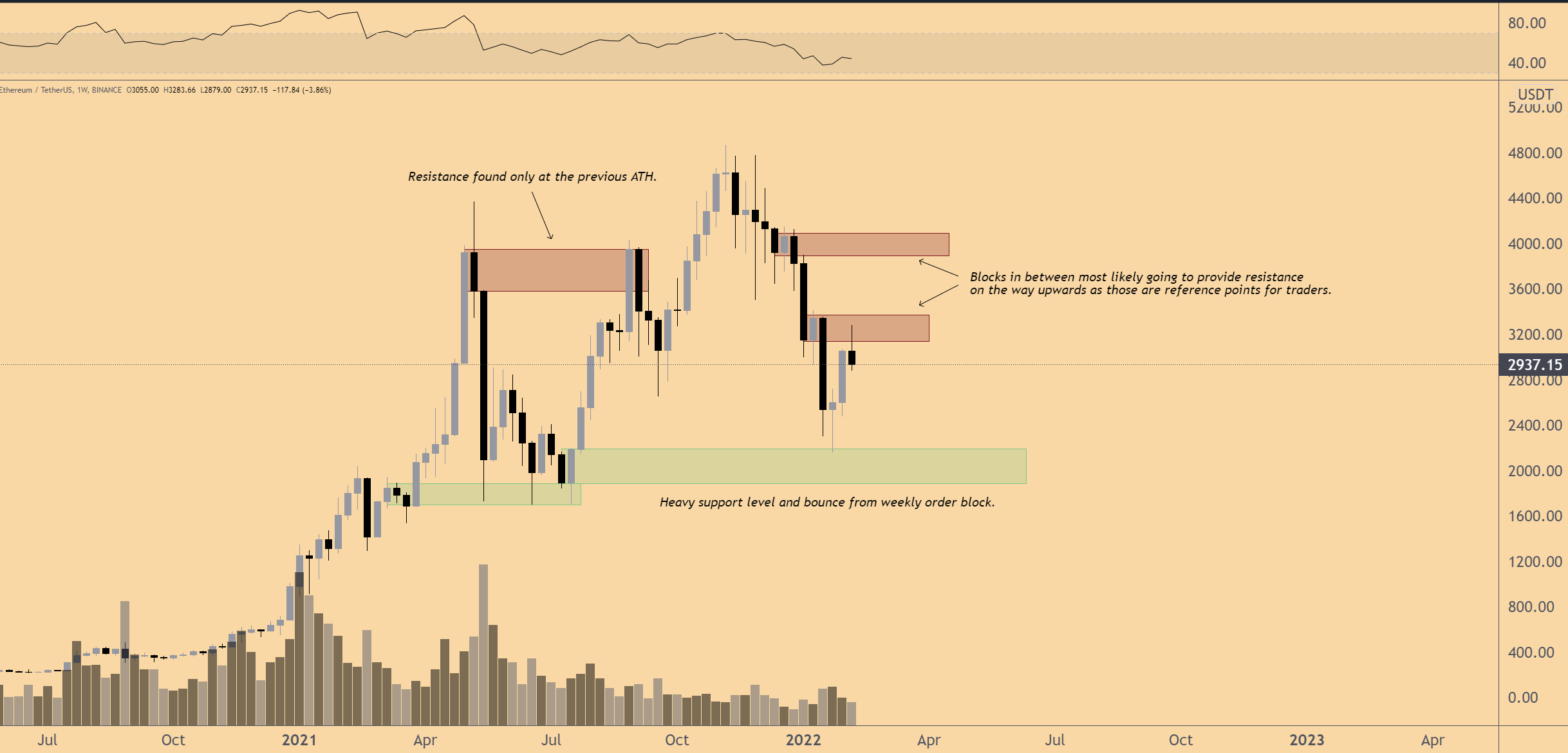 “Ethereum, just like Bitcoin, was rejected at weekly order block and heavy resistance zone, ending up in a red candle for the week. With the uncertainty arising for the coming week, I’m not expecting this to break and expecting lower tests.