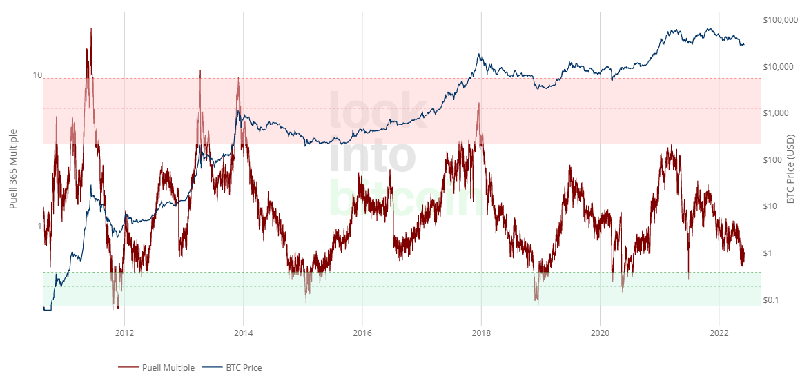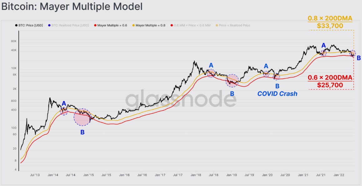 In previous bear markets, “oversold or undervalued conditions have coincided with the Mayer Multiple falling in the range of 0.6–0.8,” according to Glassnode and that is precisely the range where Bitcoin now finds itself.