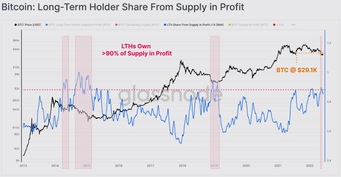 The recent drop below $30,000 for Bitcoin saw the percentage of supply in profit spike above 90% for the long-term holder cohort, suggesting short-term holders have “essentially reached a near-peak pain threshold.”