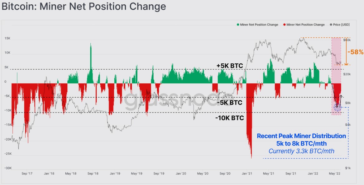 According to Glassnode, miners have also been net sellers in recent months as the decline in BTC has hampered the profitability for miners resulting in “an aggregate miner balance reduction of between 5K and 8K BTC per month.”