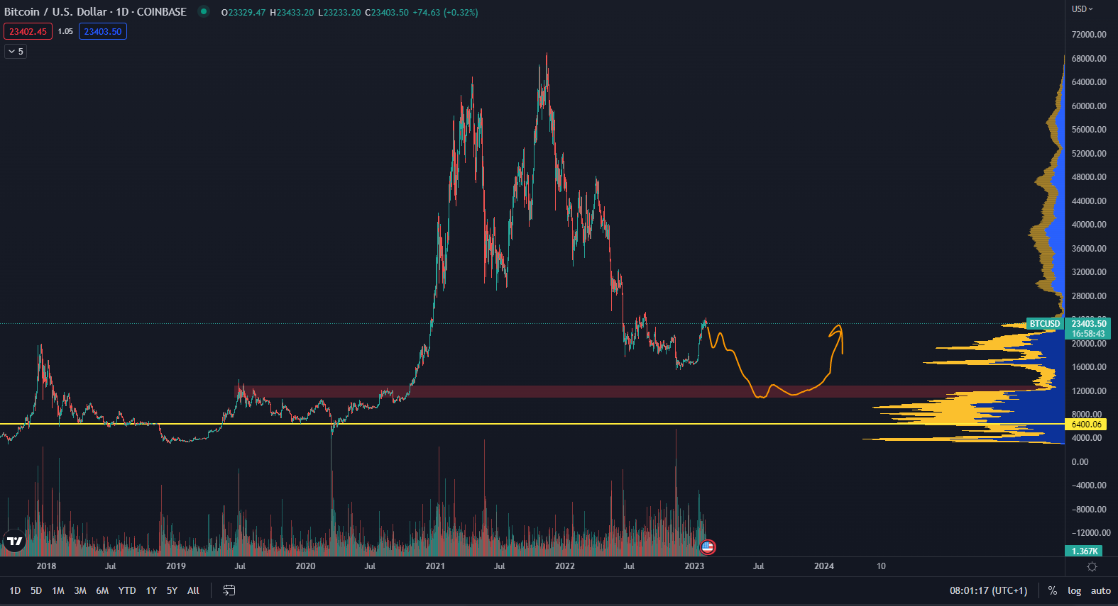 Pointa tohto scenáru je, že bitcoin napokon sformuje dlhodobé klesajúce minimum až v oblasti 12 000 dolárov, kde začínajú najväčšie transakčné objemy a až následne bude potvrdené dno korekcie. Aj v tomto scenári ale očakávame vytvorenie bullrunu pred halvingom, ktorý je naplánovaný na prelome marca a apríla 2024.