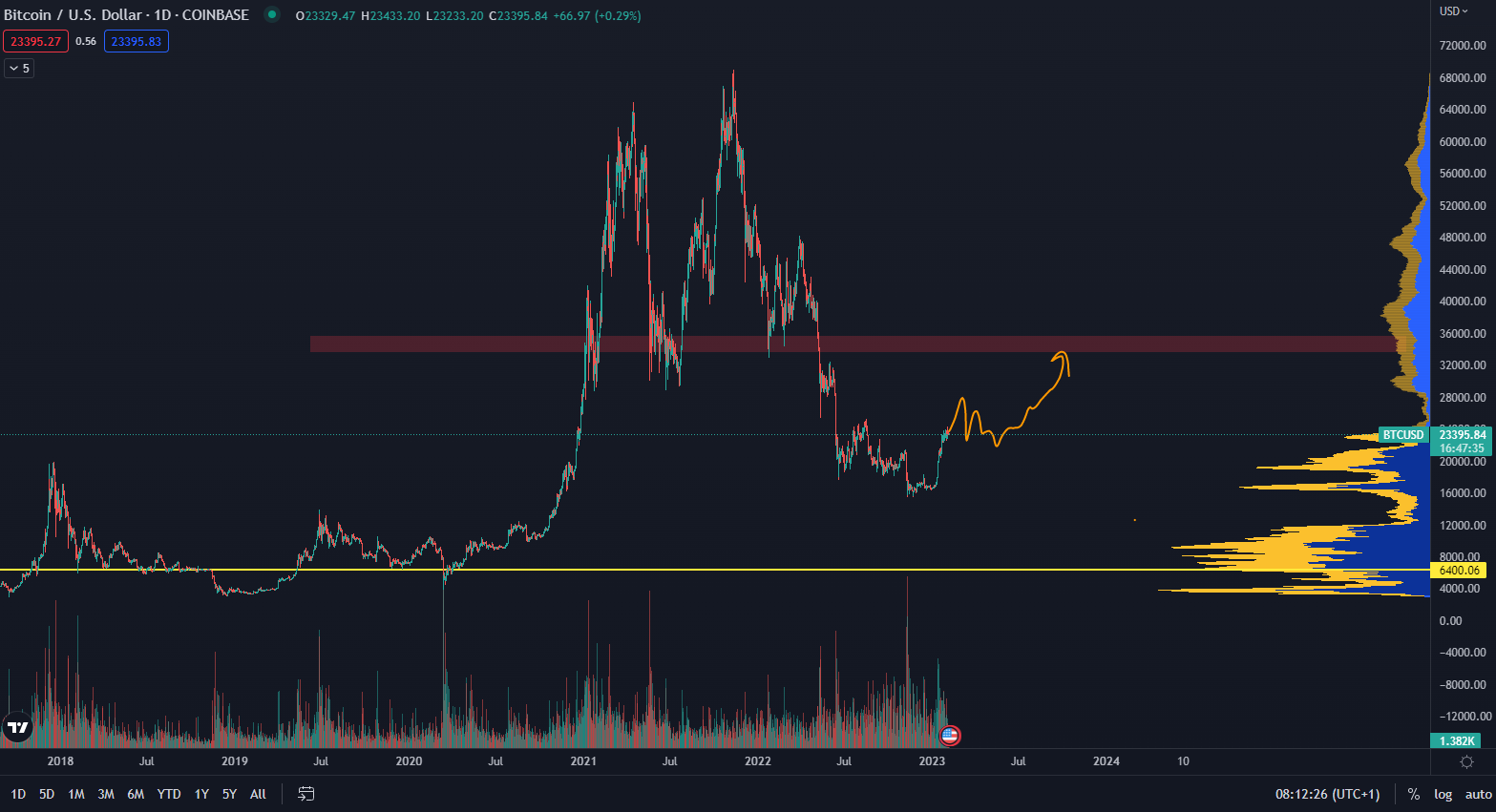 Kľúčová rezistencia je na zóne lokálneho bodu kontroly 30 000 dolárov. Okrem psychologickej úrovne ide zároveň aj o historickú reverznú zónu. Následne bude najdôležitejšie vytvoriť vyššie dlhodobé lokálne minimum oproti tomu predošlému a bullrun bude môcť pokračovať. K prekonaniu predošlého maxima 30 000 dolárov by malo dôjsť ešte v poslednom kvartáli a cena bude začiatkom roku 2024 rásť.