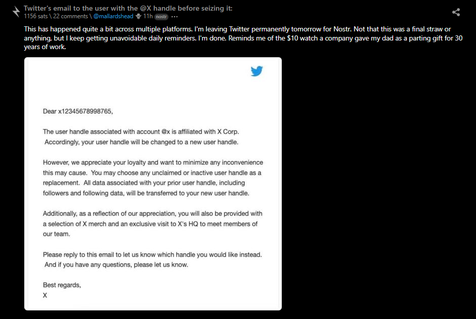 According to a screenshot shared on alternative social media platform Stacker.News, representatives of X emailed a user that had originally registered the @X Twitter profile informing them that the account would be taken over by the platform.