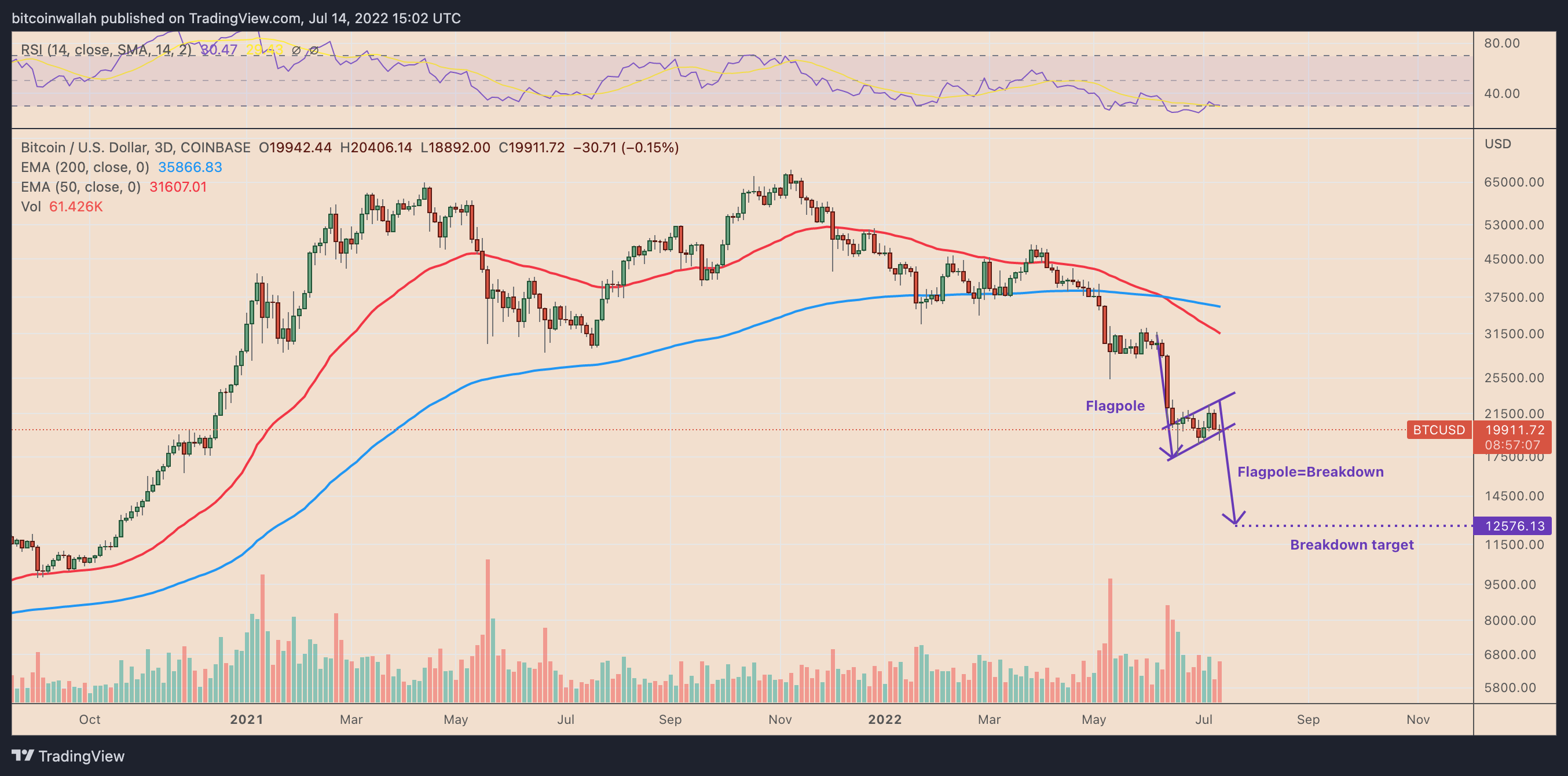 Bitcoin has been forming a potential “bear flag” pattern that could result in a drop below $13,000 by September, as illustrated above.