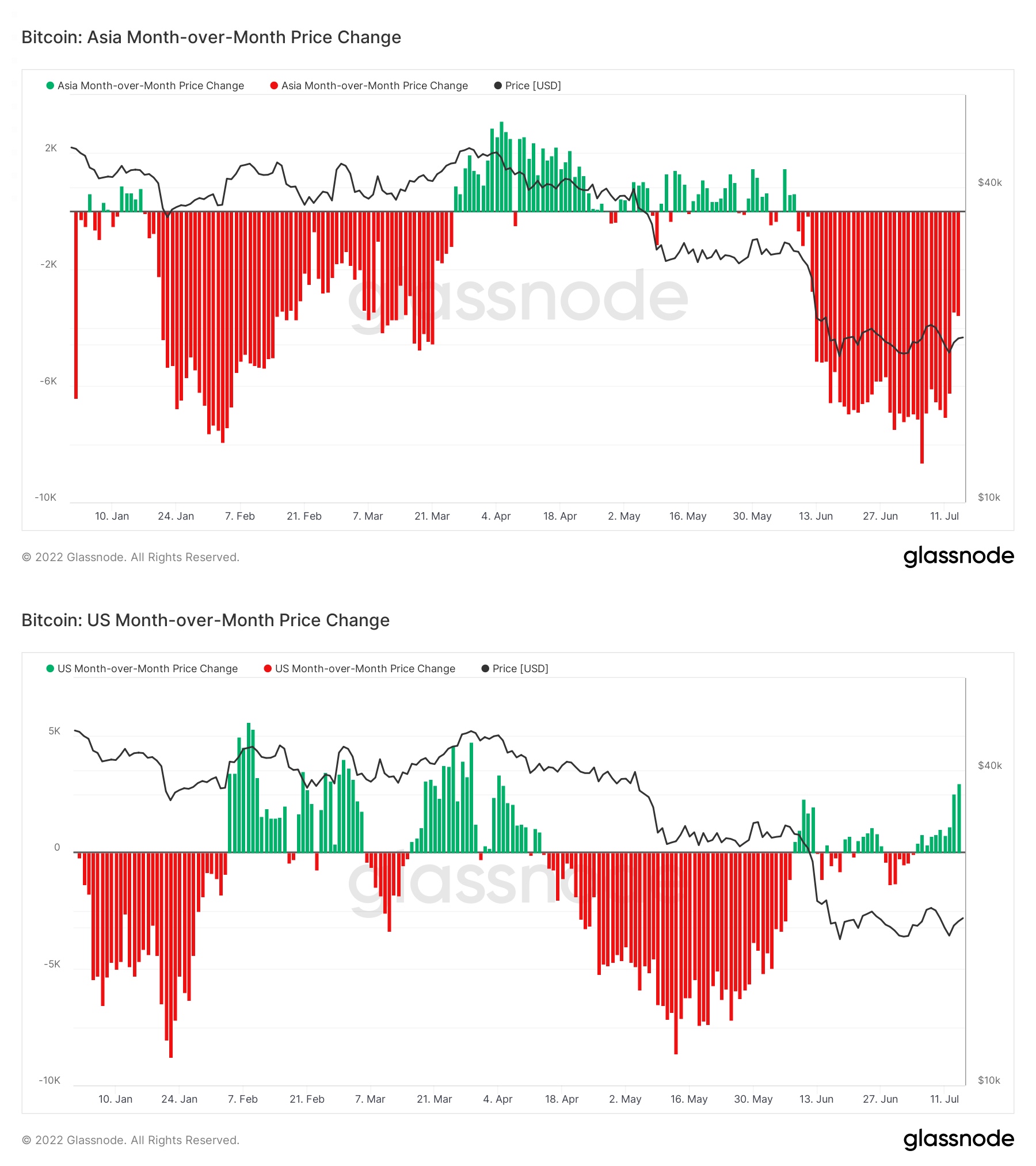 In particula, Bitcoin’s month-to-month price change, which tracks the 30-day change in the regional BTC price, has been positive only during U.S. sessions. Conversely, the metric has only been negative during Asian trading hours, data from Glassnode shows.