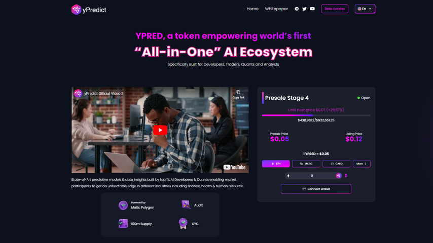 Token $YPRED predstavuje hlavný token projektu yPredict, ktorý poháňa jeho ekosystém. Projekt sa nachádza na blockchaine Polygon. Podľa ChatGPT by sa hodnota tokenu YPRED mohla do konca roka pohybovať na úrovni 0,29 USD. To by predstavovalo 480 % nárast oproti cene počas 4. fázy predpredaja, ktorá práve prebieha.