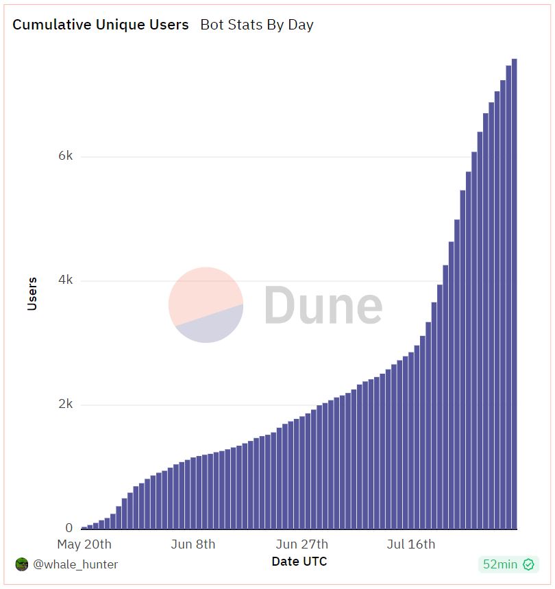 The cumulative user base of Unibot crossed 7,000 unique wallets as the bot’s usage continued to grow.