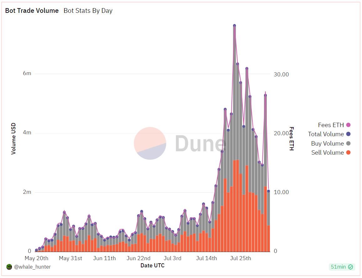 The project is a harbinger of a newfound bullish narrative around decentralized Telegram bots for trading on DEXs. The total market capitalization of the sector surged above $150 million from around $20 million at the start of July, per Coingecko.