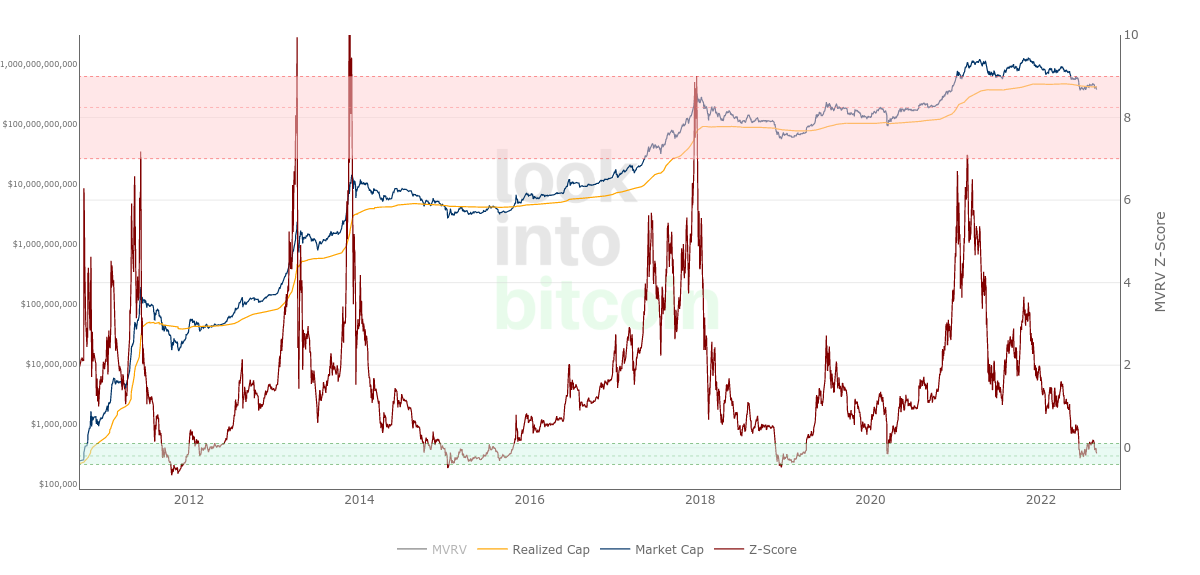 MVRV-Z uses market cap and realized price to determine how close BTC/USD is to its “fair value.”