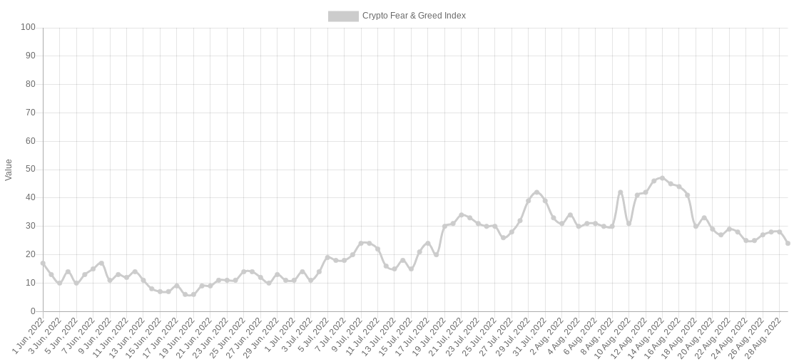 As of Aug. 29, the Crypto Fear & Greed Index is back in “extreme fear” territory at 24/100.