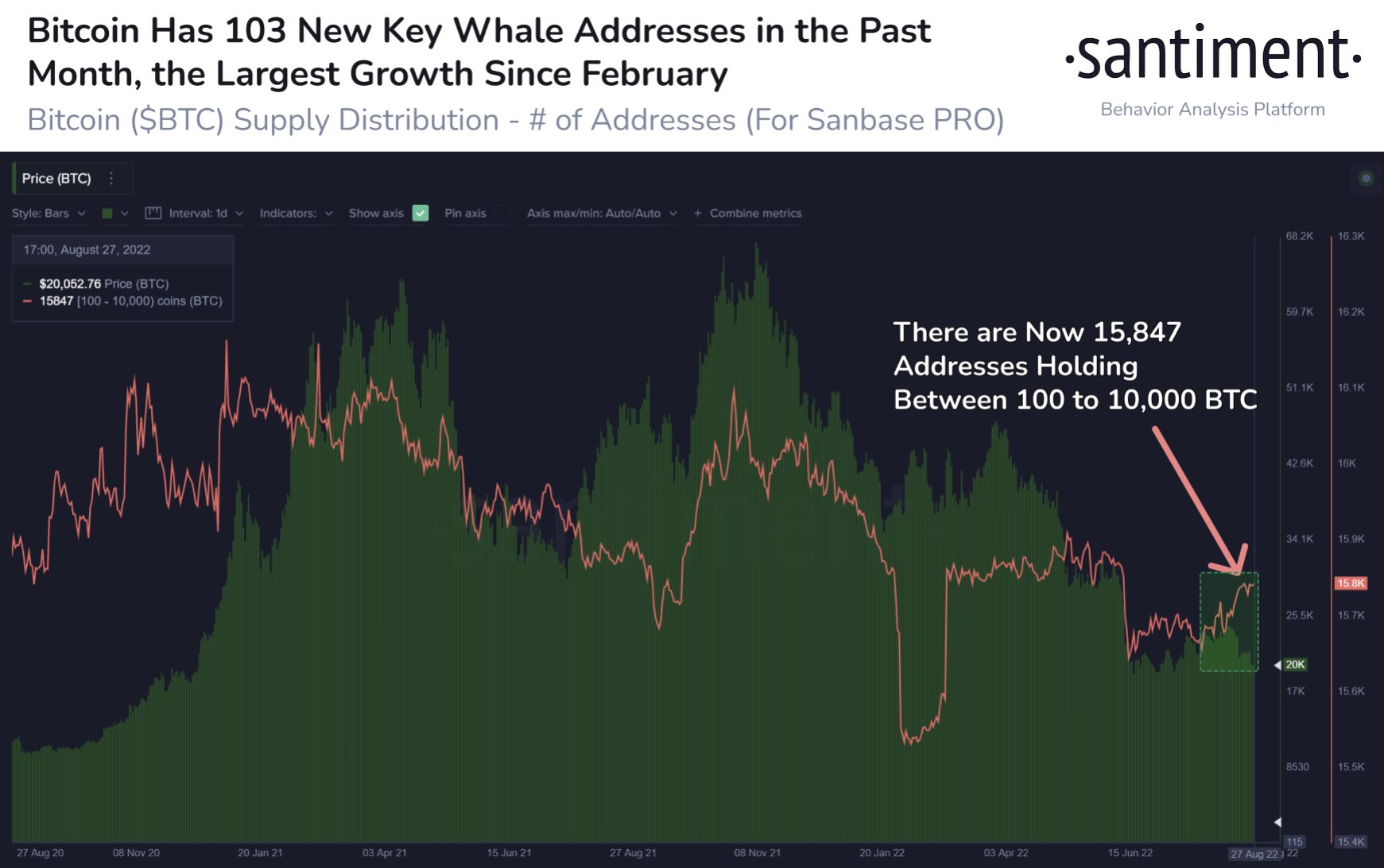 “As Bitcoin has danced around $20,000 this weekend, a positive sign is the growth in the amount of key whale addresses,” it commented on a chart for August.