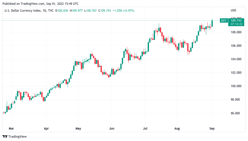 That came in the form of a resurgent U.S. dollar index (DXY) on the day, which beat previous peaks to reach 109.97, its highest since September 2002.