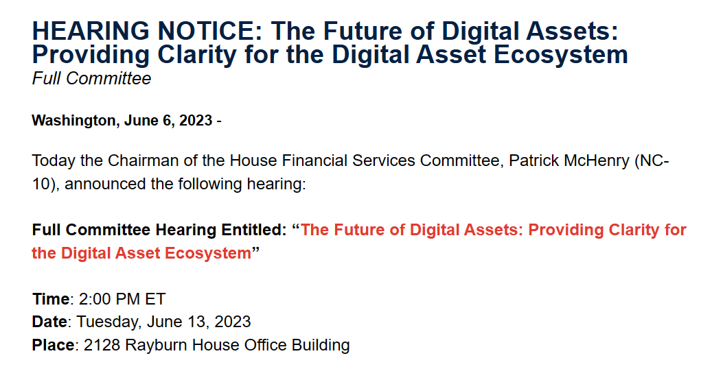 On June 6, Representative Patrick McHenry, the House Financial Services Committee chairman, announced a full committee hearing titled: “The Future of Digital Assets: Providing Clarity for the Digital Asset Ecosystem.” The hearing is scheduled for June 13 at 2:00 pm Eastern Time. According to the committee, the hearing will be live-streamed on its website.