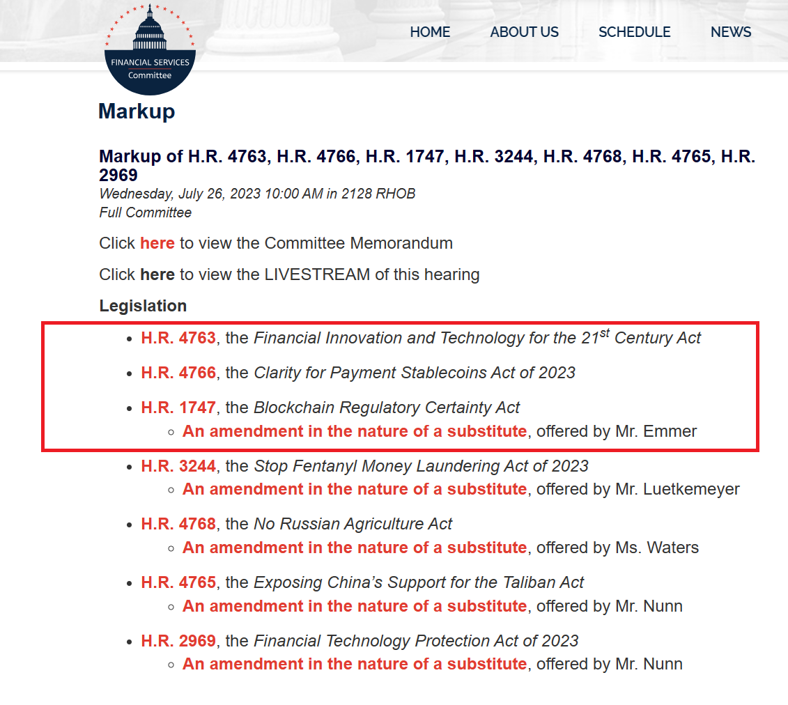 The committee will meet on July 26 to markup H.R. 4763, the Financial Innovation and Technology for the 21st Century Act; H.R. 4766, the Clarity for Payment Stablecoins Act of 2023; and H.R. 1747, the Blockchain Regulatory Certainty Act — among others.