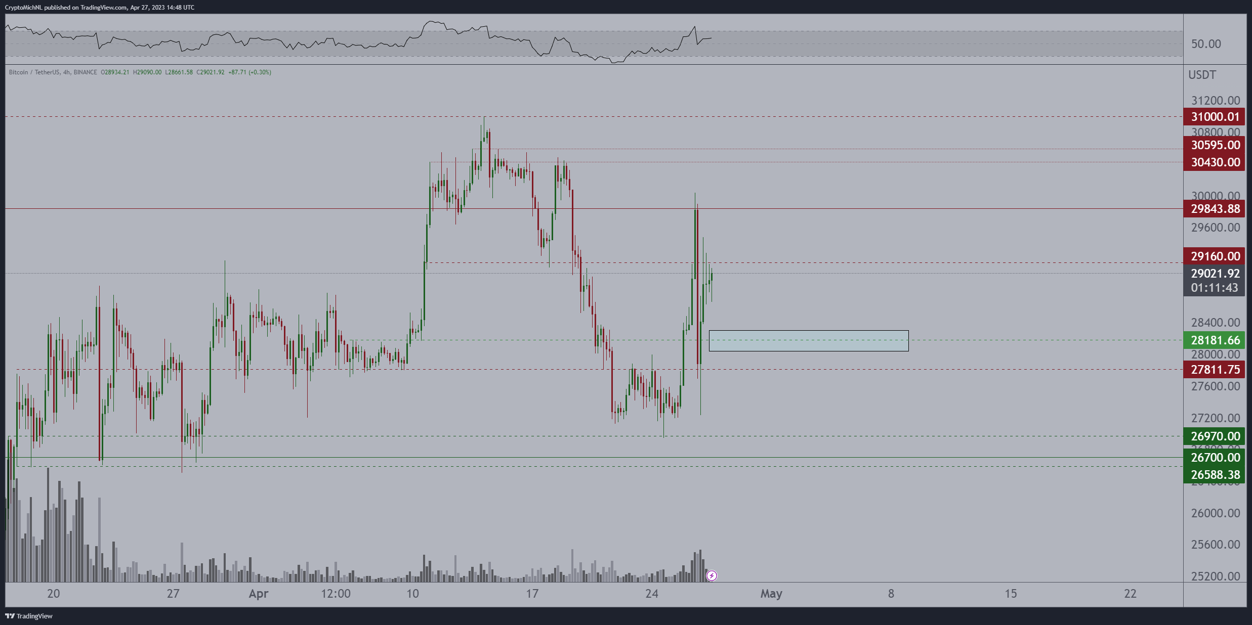 “Levels are quite clear, as Bitcoin is still at $29,000. Needs to hold $28,200 for potential longs. Breaking and flipping $29,200 is continuation towards the highs.”