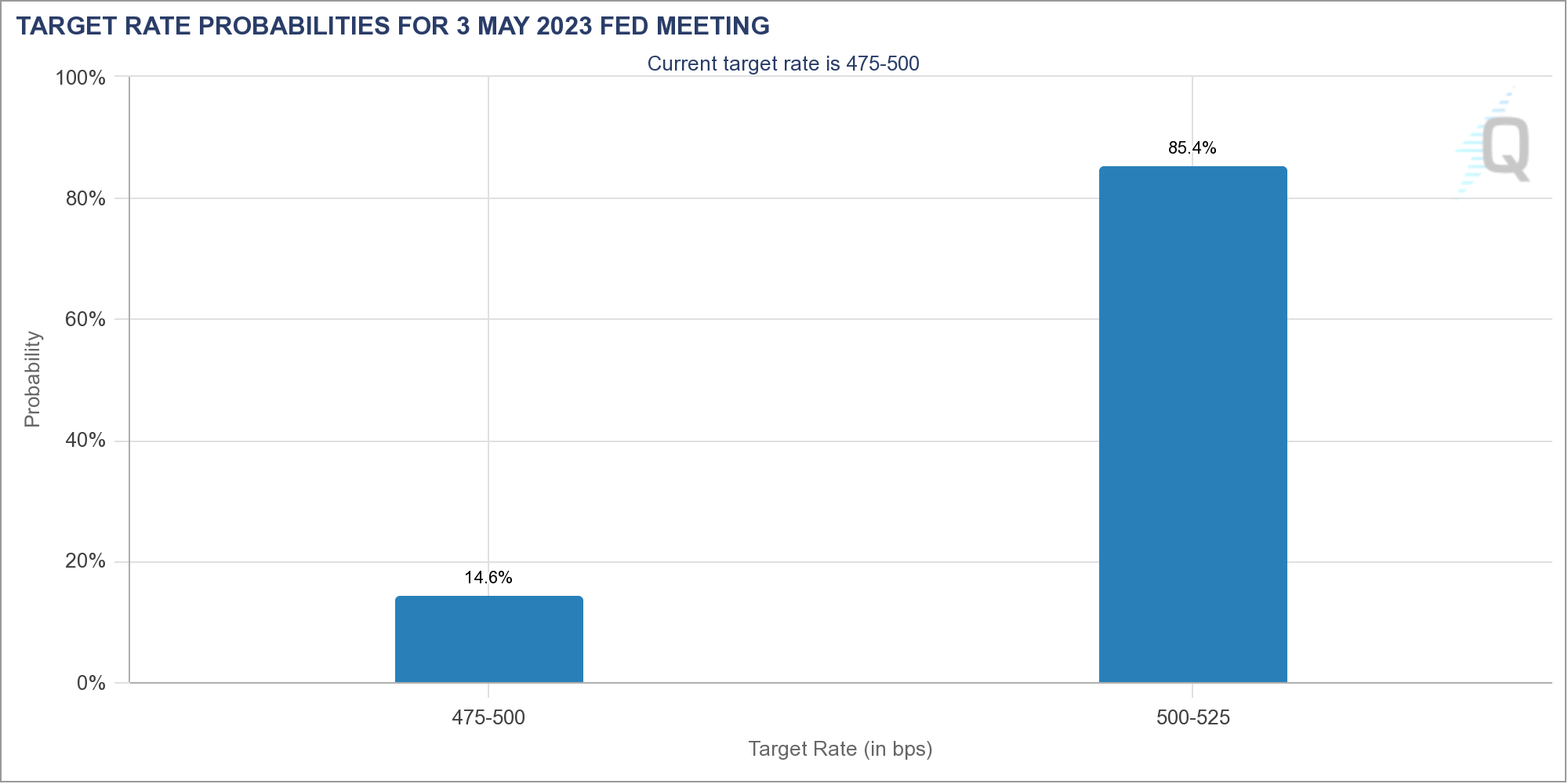 Market expectations for a 0.25% rate hike in May remained unchanged versus the start of the week as a result of the GDP data, according to CME Group’s FedWatch Tool, with the odds remaining at 85%.