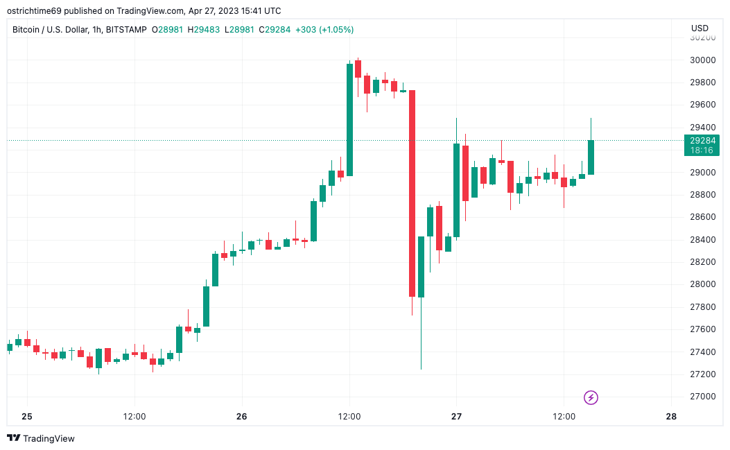 Bitcoin (BTC) stuck to $29,000 at the April 27 Wall Street open as United States GDP growth missed expectations.