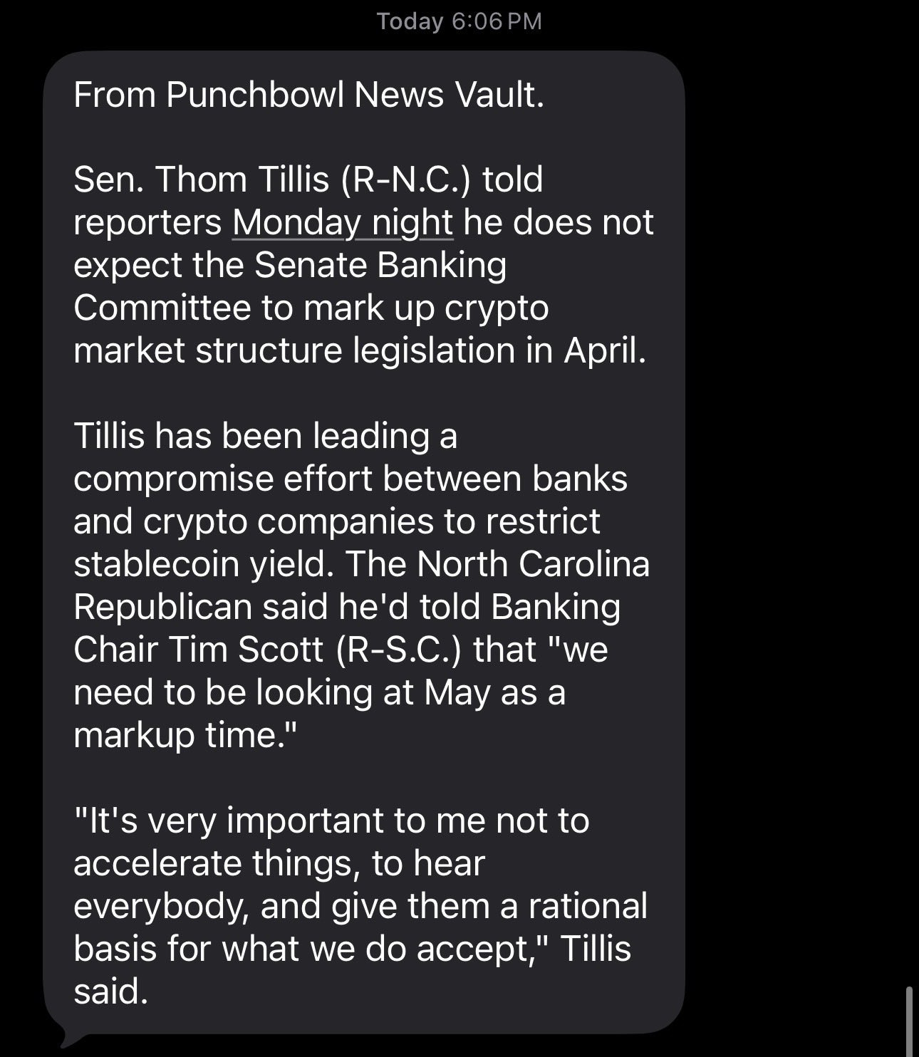 Tillis, who has been leading discussions between crypto and banking members, reportedly told Scott: “It’s very important to me not to accelerate things, to hear everybody, and give them a rational basis for what we do accept.”