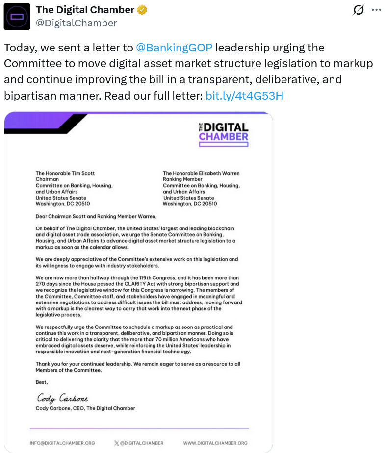 It comes the same day crypto advocacy group The Digital Chamber sent a letter to the Senate Banking Committee asking it to move the crypto market structure legislation forward to a Senate markup “as soon as the calendar allows.”