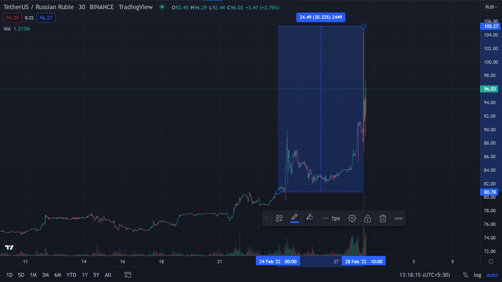 Prior to the spike, the USDT/RUB pair maintained a comparatively steady market price below 80 rubles. However, with the commencement of the Russia-Ukraine war, the ruble’s market price against USDT surged on Feb. 24, momentarily exceeding 90 rubles.