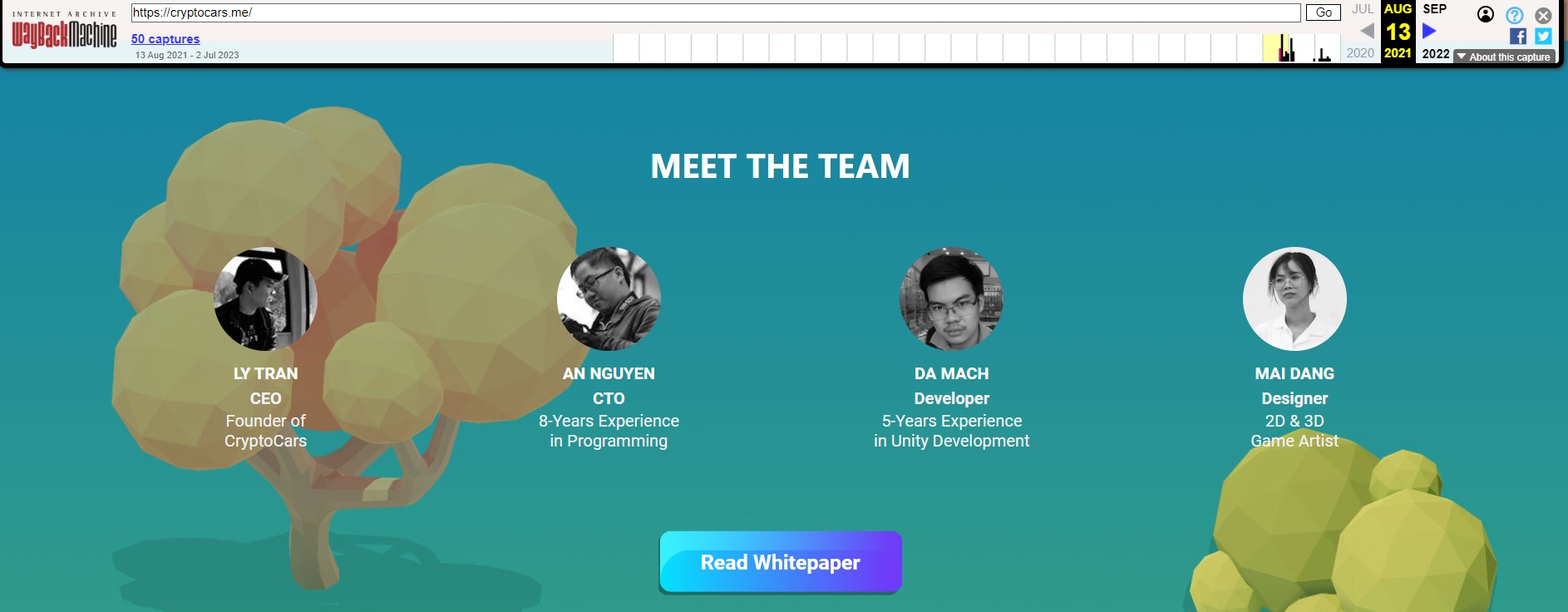 According to information left at CoinMarketCap, which has since ceased tracking the Crypto Cars token, Crypto Cars was created by a team of Vietnamese developers and was led by Ly Tran, who claimed to be a full-stack web and mobile app developer. Its chief technology officer An Nguyen was also described as a mobile developer focusing on iOS, Android and BlackBerry. However, the developers seem to have erased all traces from the internet.