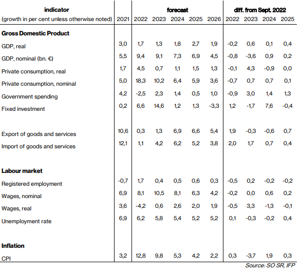V roku 2023 by malo HDP na Slovensku vzrásť o 1,3 %, hlavne vďaka národnému dopytu, stropu cien energií a čerpaniu z EÚ. Nasledujúci rok sa ekonomika zameria aj na externý dopyt. Zahraničný obchod by mal zvýšiť rast HDP aj v rokoch 2024 a 2025.