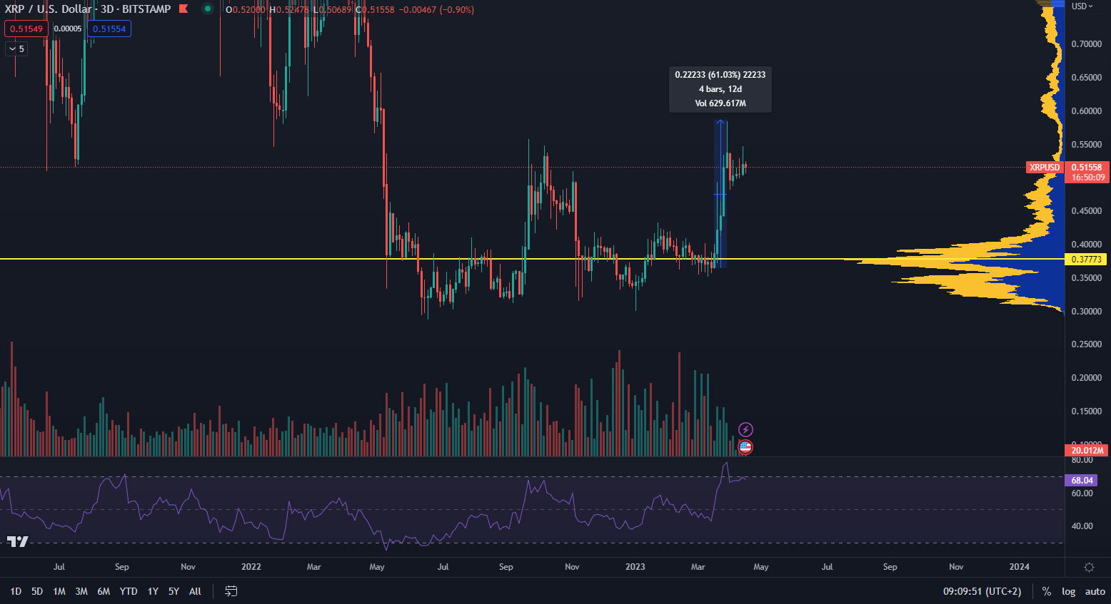 Podľa údajov z TradingView vidíme, že XRP nedávno dosiahlo rast až 60 % len v priebehu dvoch týždňov. V roku 2023 vytvoril token vzostup v najvyššom bode až 100 %, čo je približne rovnaká výkonnosť ako v prípade bitcoinu. Trhová cena stojí na rezistencii a ak sa jej podarí prekonať posledné maximum, fáza akumulácie bude definitívne minulosťou.