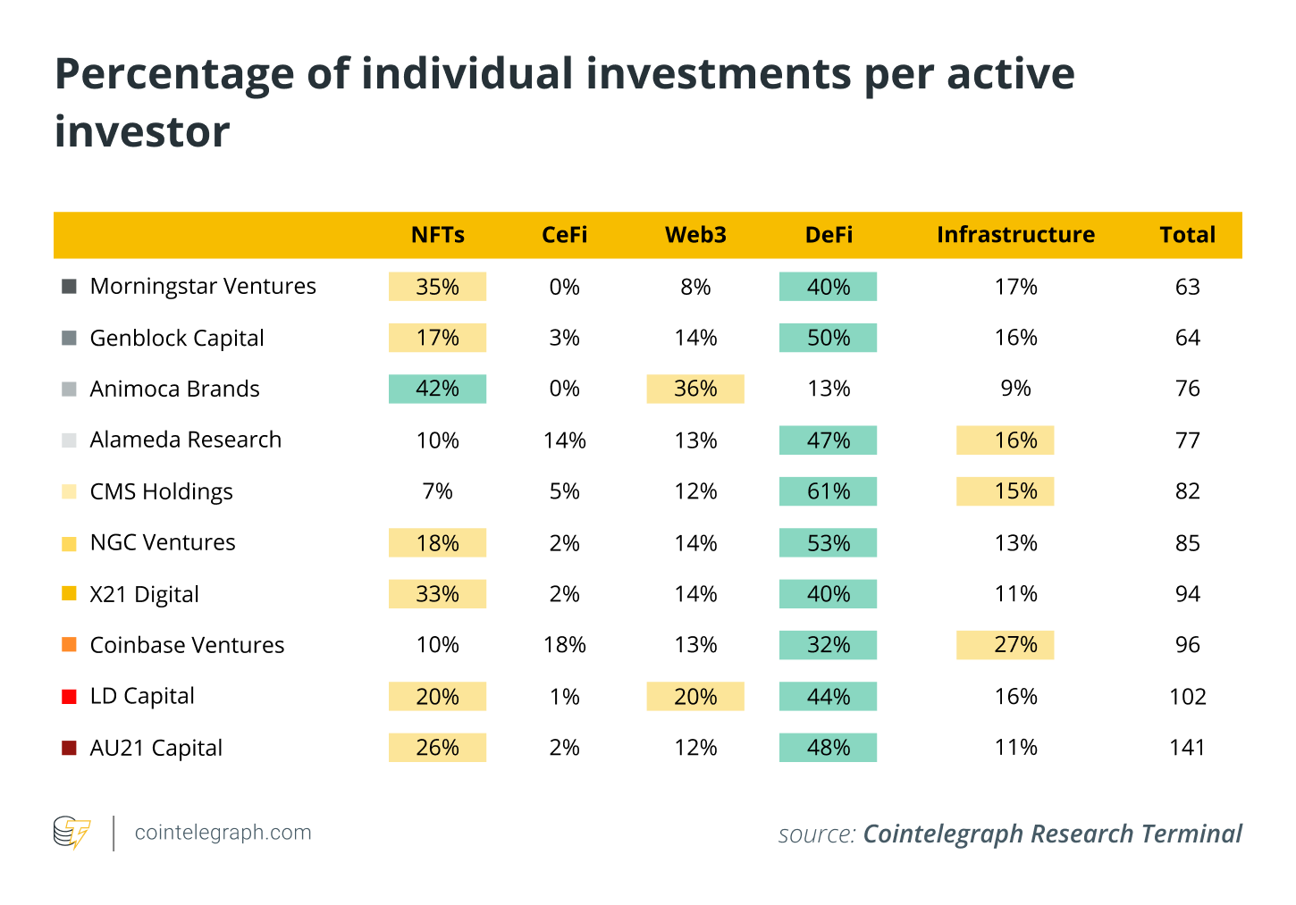 The second most invested sector was NFTs, and third place was shared between Web3 and Infrastructure. CeFi, interestingly enough, was the least invested sector. Only Alameda Research and Coinbase Ventures invested in the double-digit percentages of their overall activity.