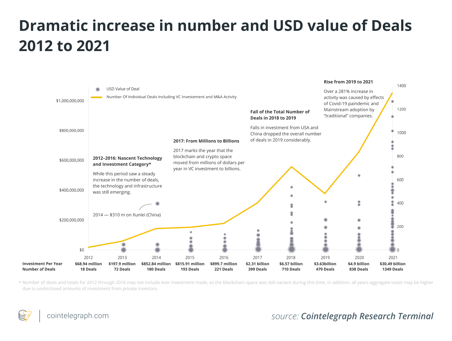 Pulling from the Cointelegraph Research Terminal’s database of venture capitalist deals, mergers and acquisitions (M&A) activity, investors and crypto companies, this 12-page report shows insights from investment activities in 2021. The report brings meaningful insights into the trends over the past few years and what VCs concentrated on in 2021.