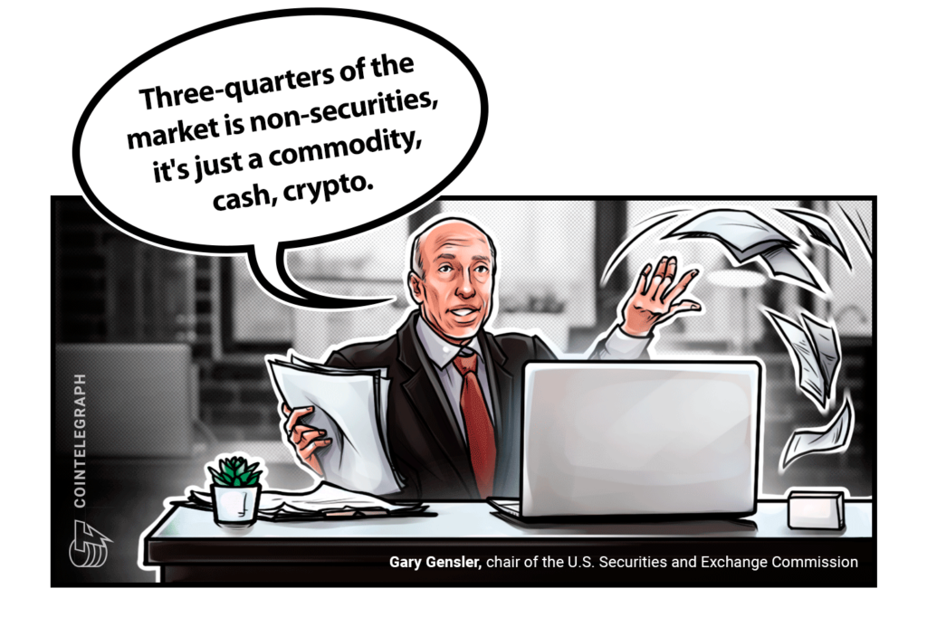 Viral clips of Securities and Exchange Commision chair Gary Gensler started circulating this week, showing him take a highly contradictory stance on crypto compared to what he holds now. As it stands, Gensler thinks almost every crypto asset apart from BTC is a security, and has pushed hard to regulate the crypto sector from that viewpoint. However, in a snippet from one of his “Blockchain and Money” lectures from 2018 — while he was working as a professor at the Massachusetts Institute of Technology — Gensler said, “Three quarters of the market is non-securities, it’s just a commodity, cash, crypto.” He even suggested Ether was not a security, despite repeatedly suggesting otherwise over the past couple years.