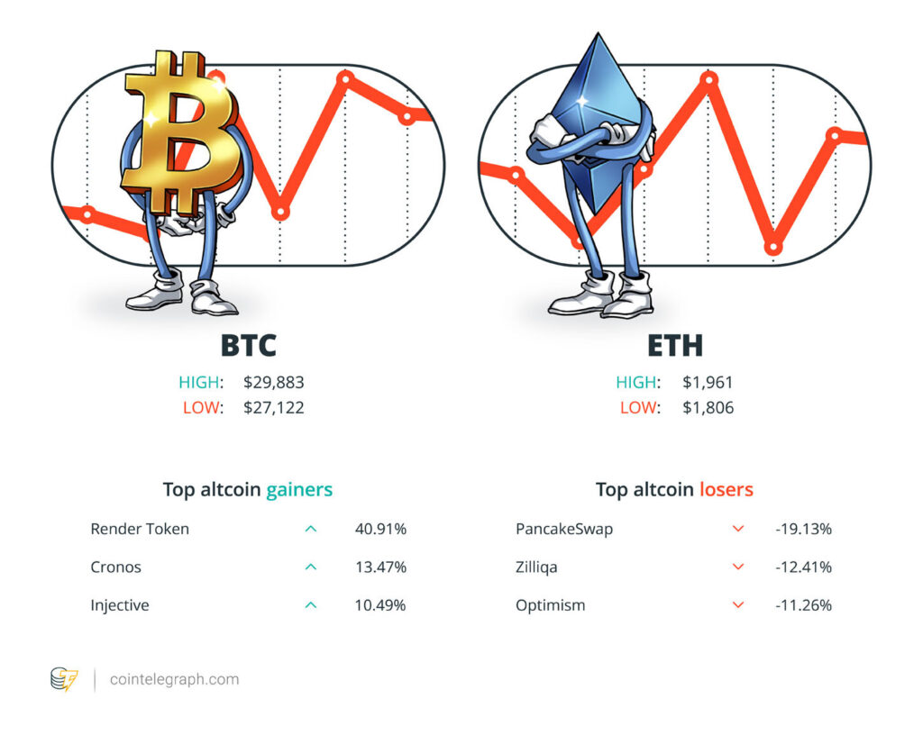 Among the biggest 100 cryptocurrencies, the top three altcoin gainers of the week are Render Token (RNDR) at 40.91%, Cronos (CRO) at 13.47% and Injective (INJ) at 10.49%.