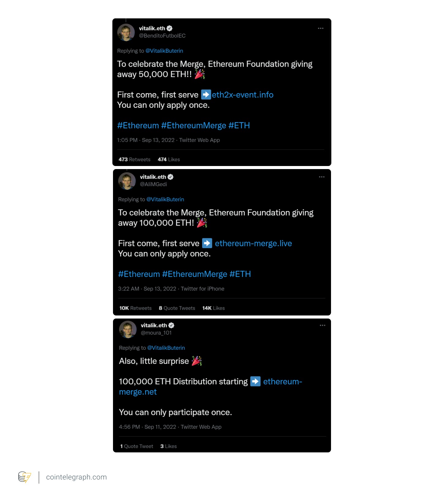 https://images.cointelegraph.com/images/840_aHR0cHM6Ly9zMy5jb2ludGVsZWdyYXBoLmNvbS91cGxvYWRzLzIwMjItMDkvZmM4MzMwMGQtYzM2OS00Y2ZkLWE0Y2YtNjBjYzIyNDYyODYzLmpwZw==.jpgThe hype around The Merge has attracted a swarm of scammers that are actively using verified Twitter accounts to impersonate Ethereum co-founder Vitalik Buterin and dupe investors.