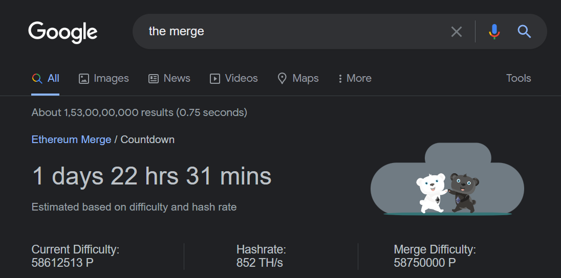 Equally excited for The Merge, Google added a countdown timer displaying the time remaining for the Ethereum blockchain to transition from proof-of-work (PoW) to a proof-of-stake (PoS) consensus mechanism.