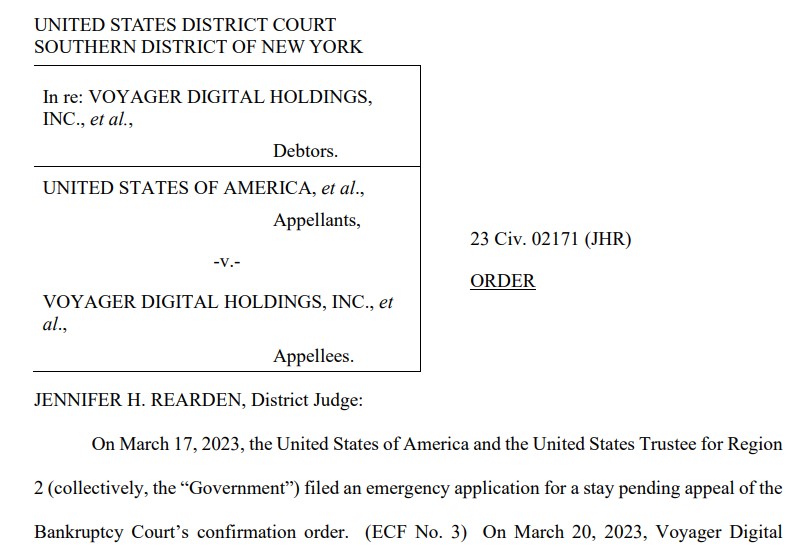 The request for an emergency stay was granted by Judge Jennifer Rearden of the U.S. District Court in New York on March 27, meaning the potential deal between Voyager and Binance.US will now need to wait until at least a decision is made on the Department of Justice’s appeal against the bankruptcy plan.