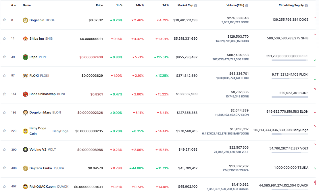 Ako môžeme vidieť na obrázku nižšie, meme coiny sú zoradené podľa trhovej kapitalizácie na stránke CoinMarketcap. Kryptomeny mong, wojak a aidoge sa nachádzajú na omnoho nižších priečkach, no ich nedávny rast spôsobil lavínu novej mánie.
