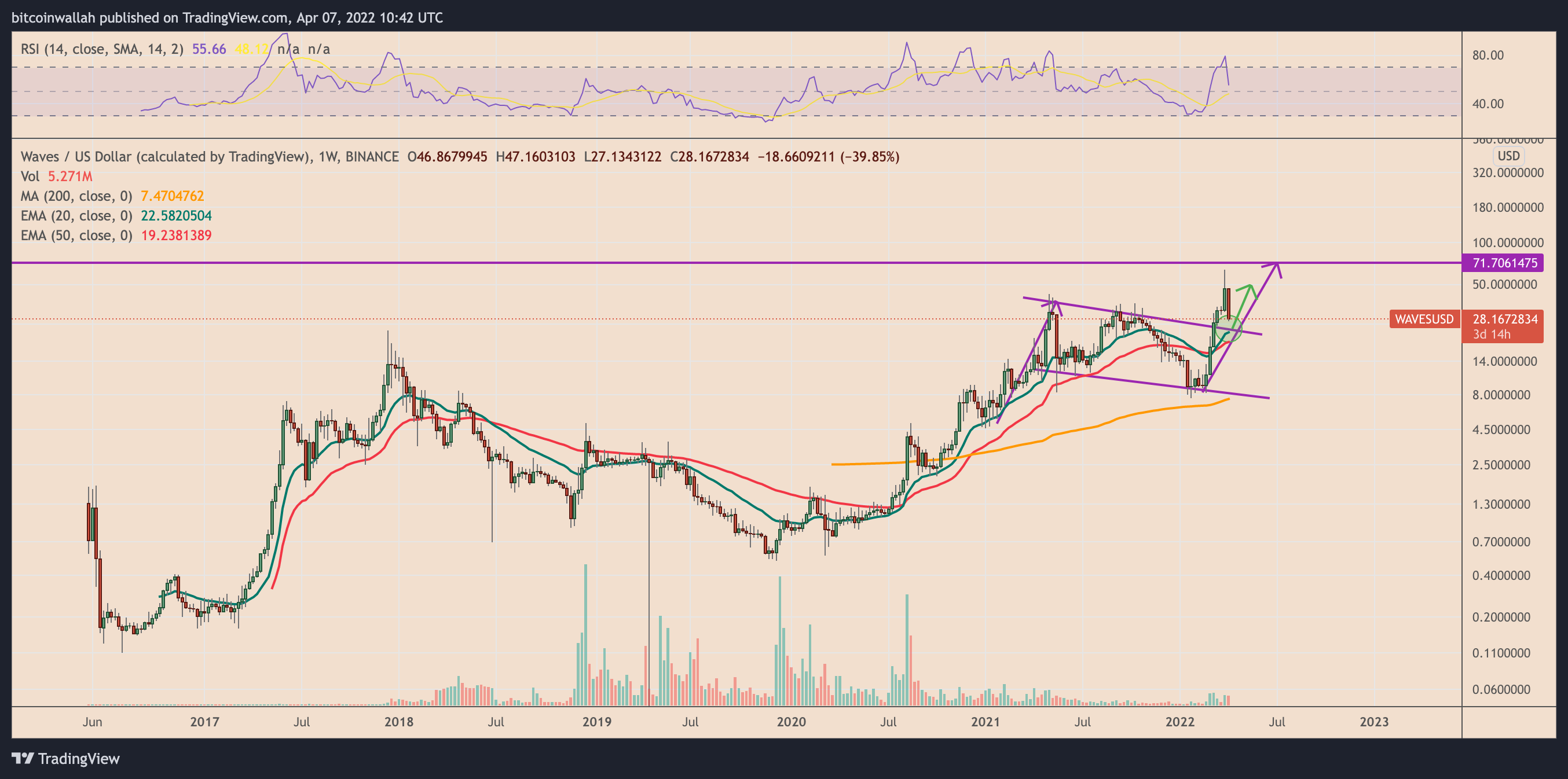 Notably, the ongoing correction brings WAVES closer to testing another double-layered support zone, defined by its 20-week EMA (the green wave) and the upper trendline of its previous “bull flag” setup, as shown in the chart below.