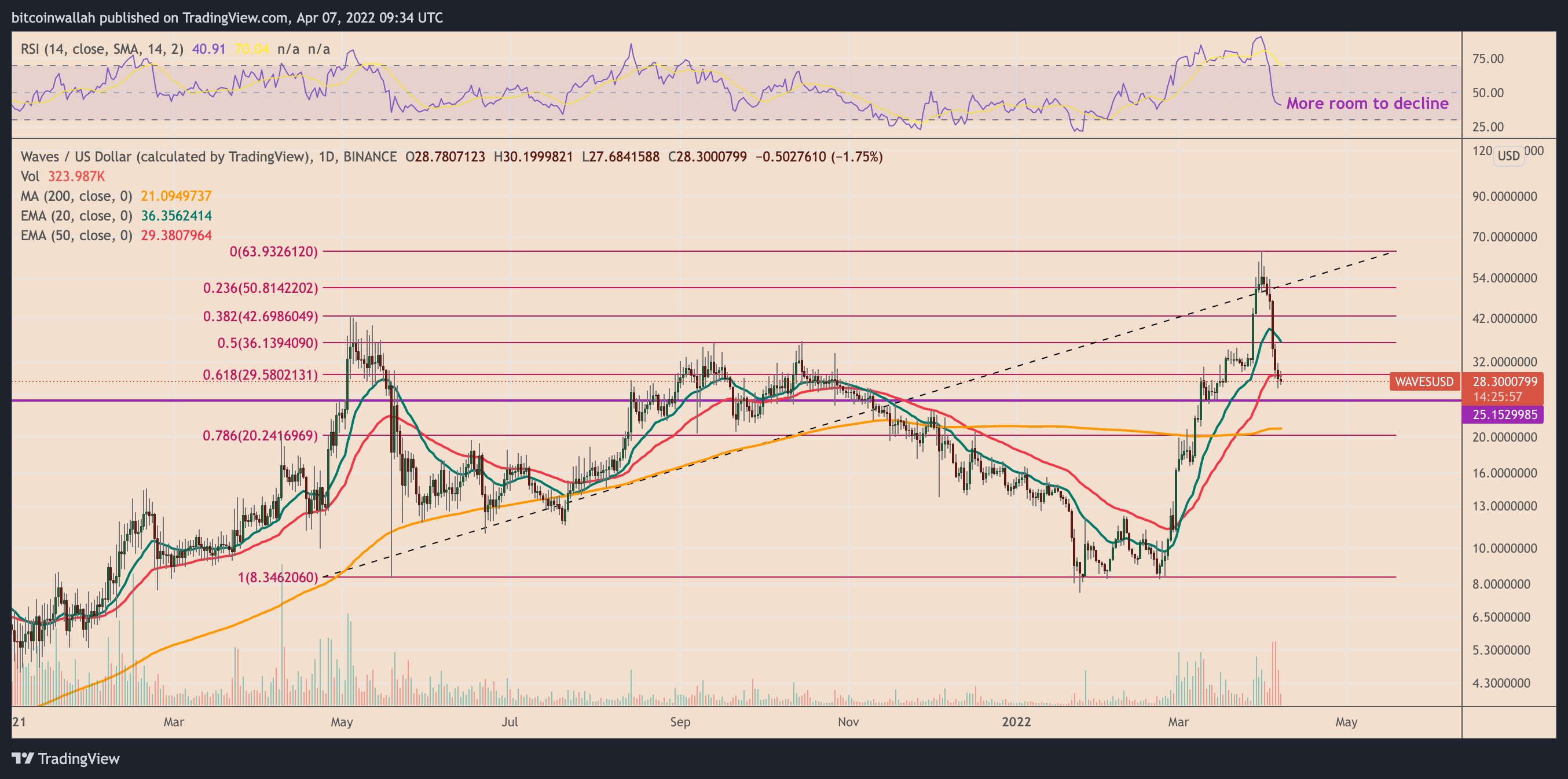 Notably, the confluence comprises WAVES’ 50-day exponential moving average (50-day EMA; the red wave) and the 61.8% Fib line of the Fibonacci retracement graph — drawn from $64-swing high to $8.34-swing low.