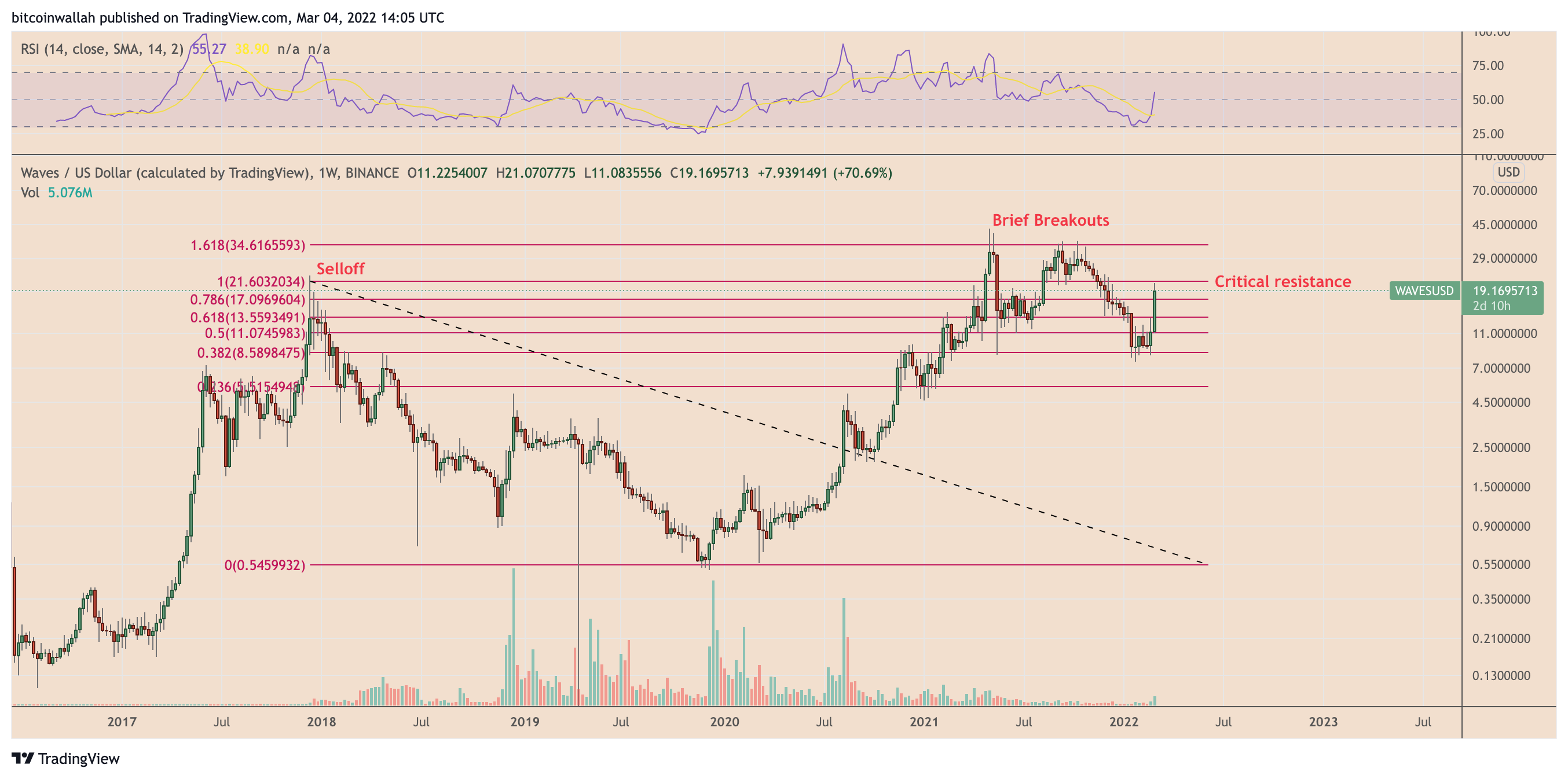 For instance, in April 2021 and November 2021, bulls attempted to flip $21.60 as support but failed. As a result, WAVES has spent most of its time under the said 1.00 Fib level than above it, suggesting an unstable upside sentiment around it.