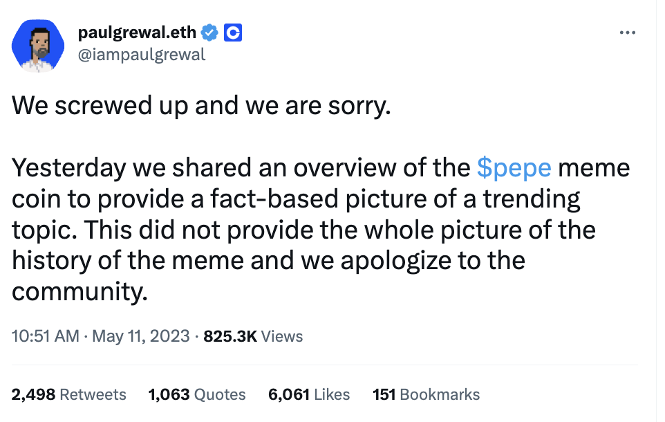 In a May 11 tweet, Grewal said Coinbase had “screwed up” in sharing information about the Pepe meme, which included that it had been co-opted by many alt-right groups as a hate symbol. According to the Coinbase CLO, the exchange was attempting “to provide a fact-based picture of a trending topic” to its users.