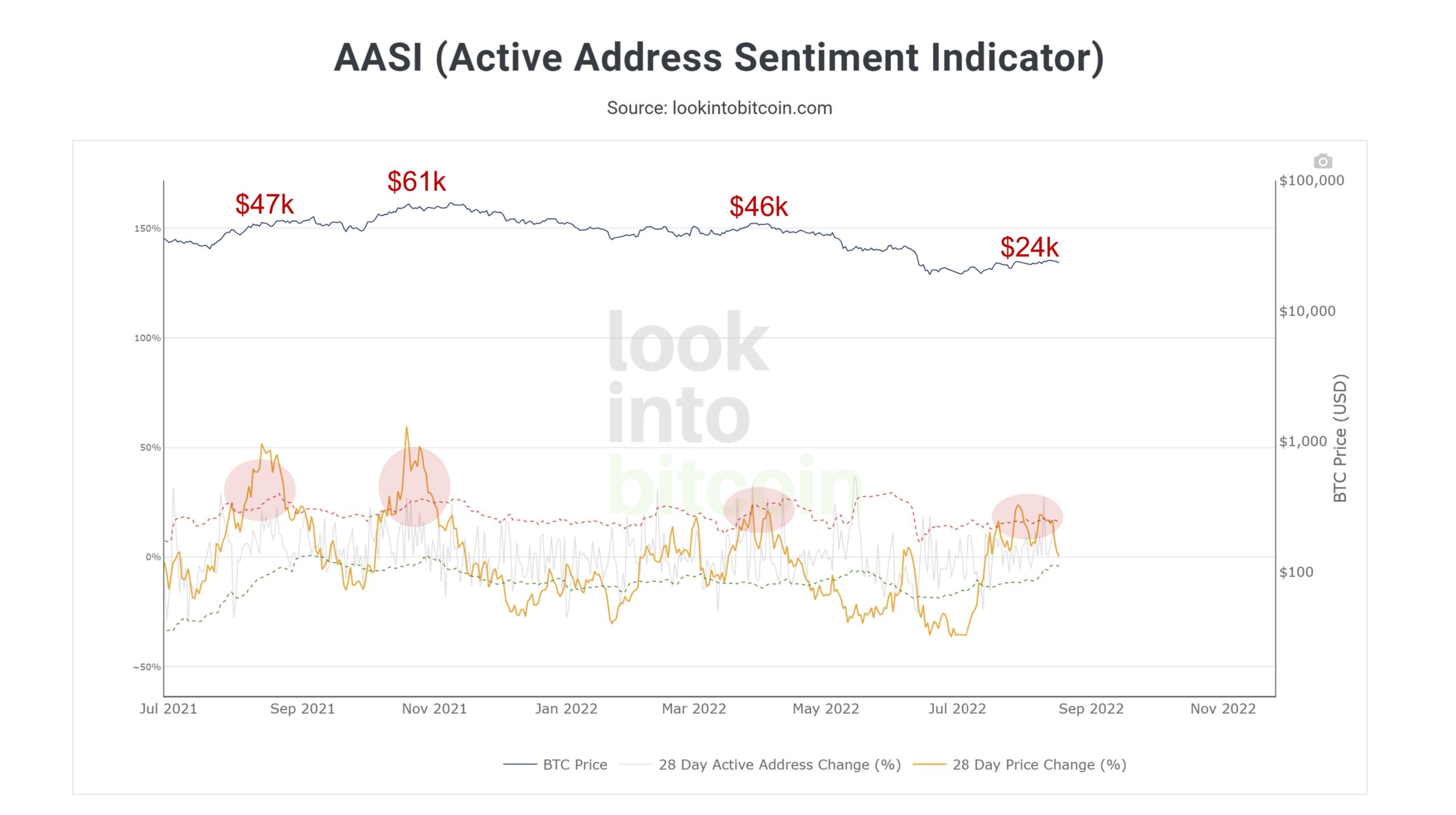 “AASI (Active Address Sentiment Indicator) has been indicating that the current price move has not been supported by a sufficient increase in active addresses on the Bitcoin network,” he summarized.