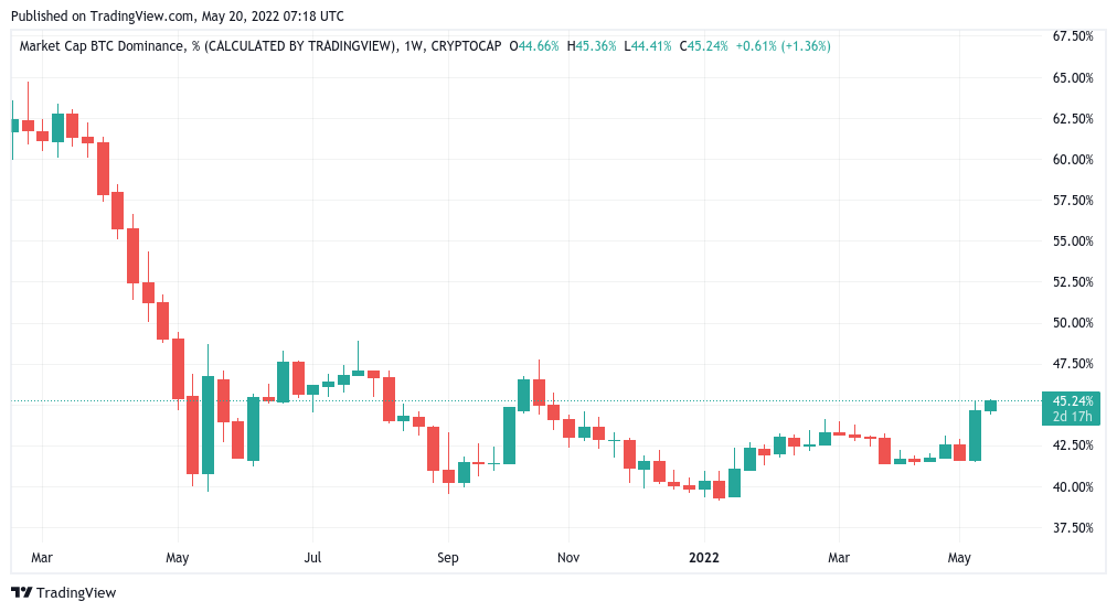 At 44.8%, Bitcoin’s share of the overall cryptocurrency market cap was at its highest since October 2021 at the time of writing.