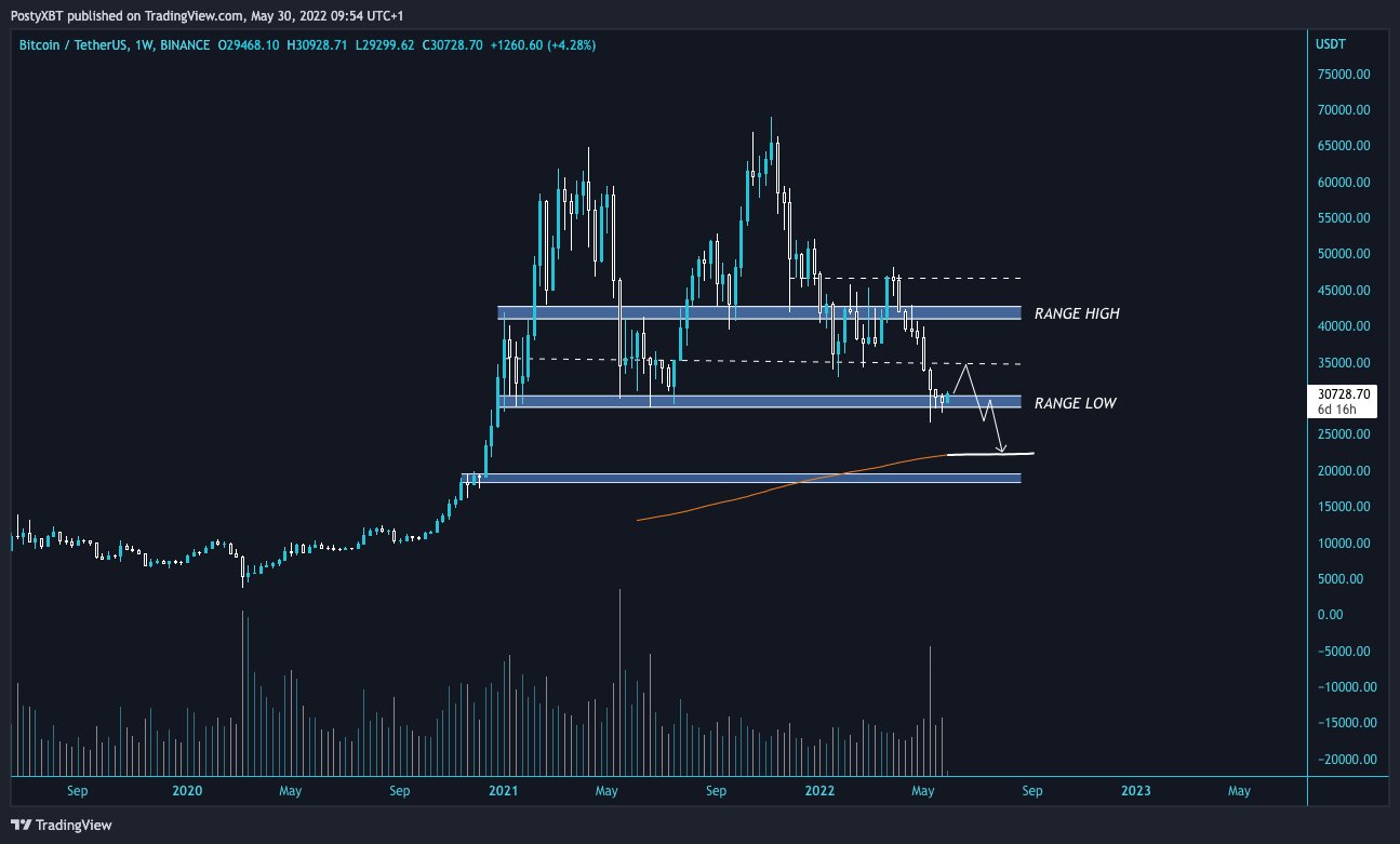 For instance, PostyXBT, an independent market analyst, argues that the token could fall toward its 200-week moving average (the $20,000-22,000 range) next, as shown in the setup below.