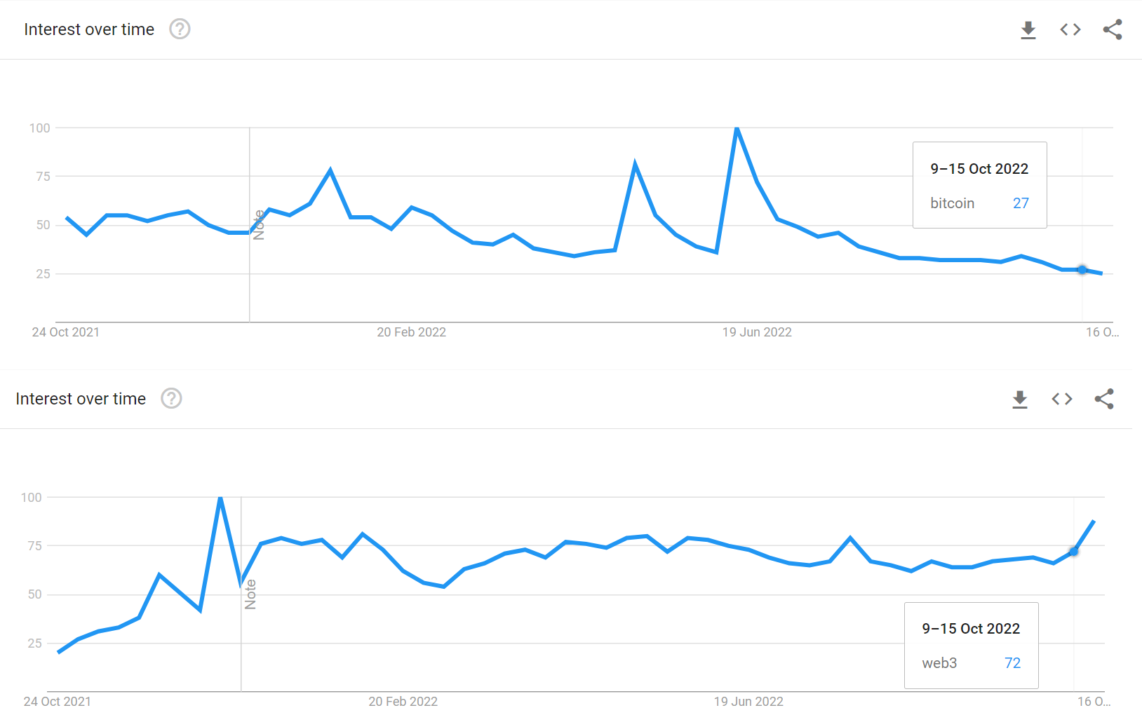 As shown above, the interest in Web3 stands at 72, while for Bitcoin, the number has come down to 27 — a three-times difference based on peak performance.