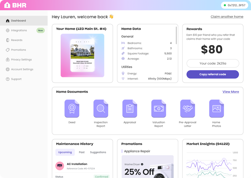 Rogers explained that BHR allows homeowners to claim their home as a verified NFT upon completion of a thorough Know Your Customer (KYC) process. Once verified, homeowners’ NFTs are placed on the BHR platform, which then allows for organizations across the real estate industry to build services by consuming data from the platform. This allows both organizations and homeowners the ability to monetize their data.