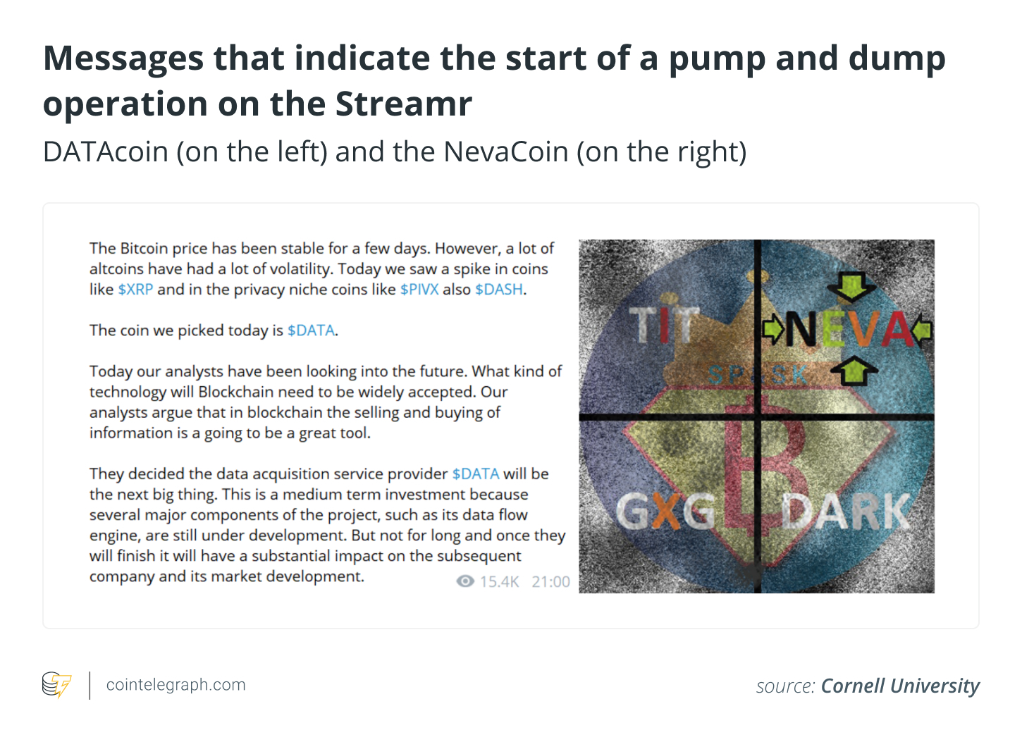 The name of the cryptocurrency is typically written in a graphic that has been deliberately obscured so that only humans can decipher it rapidly. The obfuscation aims to hinder bots’ from parsing the message using optical character recognition (OCR) techniques and launching market operations more quickly than people.